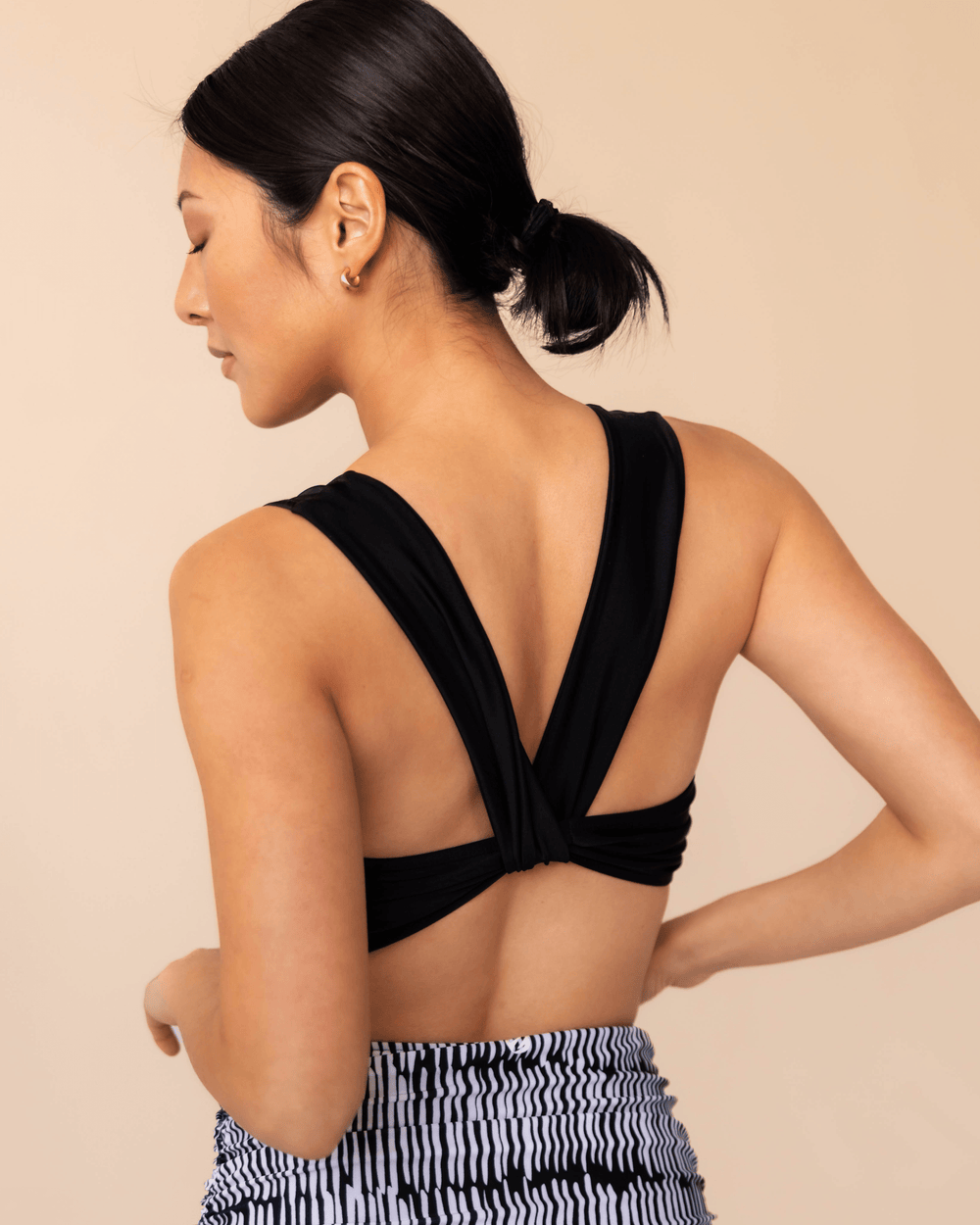 This beautiful v-neck swim top features our head-turning Nani Switch V back creating elevated style in a sporty design. Made to look great and feel comfortable while attacking any adventure. Solid black.FIT