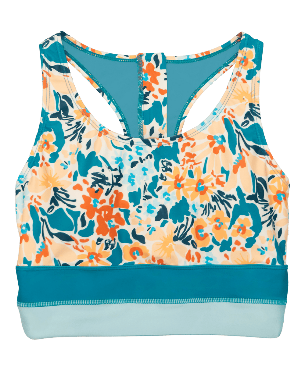 A Nani favorite. These colorblock high-waisted bottoms feature a wide contrast waistband in layered blue hues, paired with a vibrant floral print. Soft, stretchy fabric keeps them comfortable and adventure-ready, while the high-rise design offers a flattering, stay-put fit.