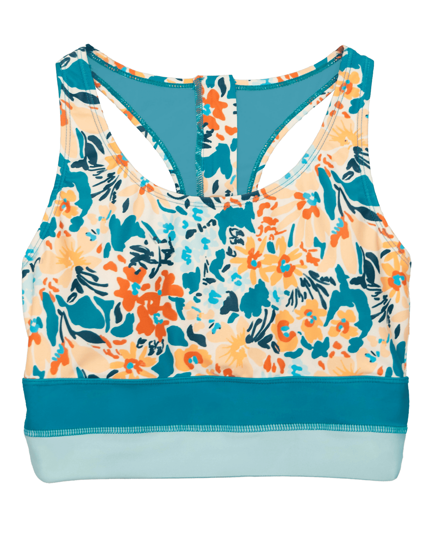 The floral fabric paired with contrast blue bands adds a sporty edge. Built for movement yet designed to flatter, this crop takes you from surf sessions to shoreline with ease.